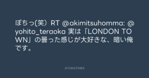 寺岡呼人 @yohito_teraoka – 8:51・2010年11月5日 2010 11/05 寺岡呼人 2010-11-05 ぽちっ(笑)RT @akimitsuhomma: @yohito_teraoka 実は「LONDON TOWN」の曇った感じが大好きな、暗い俺です。 Source:https://x.com/yohito_teraoka/status/33427905786... text X Post 寺岡呼人 寺岡呼人 この記事が気に入ったら フォローしてね! Follow @OtokoTimes1988 よかったらシェアしてね! URLをコピーしました! 寺岡呼人 @yohito_teraoka - 8:47・2010年11月5日 寺岡呼人 @yohito_teraoka - 17:58・2010年11月5日 関連記事 Artist 寺岡呼人 1968.02.07