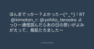ほんまでっかー?よかったー(^_^)!RT @kimatan_r: @yohito_teraoka よっひー通信読んだらあの日の思いがよみがえって、鳥肌たちました~