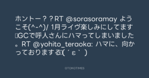 ホントー??RT @sorasoramay ようこそ(^-^)/ 1月ライヴ楽しみにしてます♪GCで呼人さんにハマってしまいました。RT @yohito_teraoka: ハマに、向かっておりまする♪(´ε` )