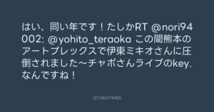 寺岡呼人 @yohito_teraoka – 0:54・2010年11月21日 2010 11/21 寺岡呼人 2010-11-21 はい、同い年です!たしかRT @nori94002: @yohito_teraoka この間熊本のアートプレックスで伊東ミキオさんに圧倒されました~チャボさんライブのkey.なんですね! Source:https://x.com/yohito_teraoka/status/60126030085... text X Post 寺岡呼人 寺岡呼人 この記事が気に入ったら フォローしてね! Follow @OtokoTimes1988 よかったらシェアしてね! URLをコピーしました! 寺岡呼人 @yohito_teraoka - 0:48・2010年11月21日 寺岡呼人 @yohito_teraoka - 1:06・2010年11月21日 関連記事 Artist 寺岡呼人 1968.02.07