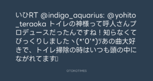 いひRT @indigo_aquarius: @yohito_teraoka トイレの神様って呼人さんプロデュースだったんですね!知らなくてびっくりしましたヽ(*’0’*)ツあの曲大好きで、トイレ掃除の時はいつも頭の中にながれてます♪