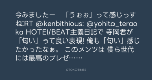 今みましたー 「うぉぉ」って感じっすね♪RT @kenbithious: @yohito_teraoka HOTEI/BEAT主義日記で 寺岡君が「匂い」って良い表現! 俺も「匂い」感じたかったなぁ。 このメンツは 僕ら世代には最高のプレゼントですよね^^