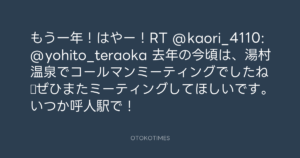 もう一年!はやー!RT @kaori_4110: @yohito_teraoka 去年の今頃は、湯村温泉でコールマンミーティングでしたね♪ぜひまたミーティングしてほしいです。いつか呼人駅で!