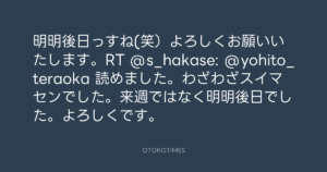 明明後日っすね(笑)よろしくお願いいたします。RT @s_hakase: @yohito_teraoka 読めました。わざわざスイマセンでした。来週ではなく明明後日でした。よろしくです。