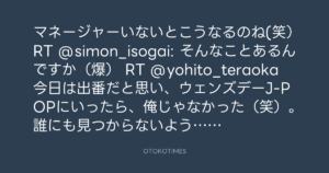マネージャーいないとこうなるのね(笑)RT @simon_isogai: そんなことあるんですか(爆) RT @yohito_teraoka 今日は出番だと思い、ウェンズデーJ-POPにいったら、俺じゃなかった(笑)。誰にも見つからないように出てきました( ; ; )