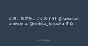 寺岡呼人 @yohito_teraoka – 1:35・2010年12月8日 2010 12/08 寺岡呼人 2010-12-08 ぶち、夜更かしじゃの?RT @keisuketomiyama: @yohito_teraoka 作る! Source:https://x.com/yohito_teraoka/status/12183392468... text X Post 寺岡呼人 寺岡呼人 この記事が気に入ったら フォローしてね! Follow @OtokoTimes1988 よかったらシェアしてね! URLをコピーしました! 寺岡呼人 @yohito_teraoka - 1:30・2010年12月8日 寺岡呼人 @yohito_teraoka - 16:50・2010年12月8日 関連記事 Artist 寺岡呼人 1968.02.07