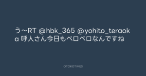 寺岡呼人 @yohito_teraoka – 1:52・2010年12月13日 2010 12/13 寺岡呼人 2010-12-13 う〜RT @hbk_365 @yohito_teraoka 呼人さん今日もベロベロなんですね Source:https://x.com/yohito_teraoka/status/13999600604... text X Post 寺岡呼人 寺岡呼人 この記事が気に入ったら フォローしてね! Follow @OtokoTimes1988 よかったらシェアしてね! URLをコピーしました! 寺岡呼人 @yohito_teraoka - 1:50・2010年12月13日 寺岡呼人 @yohito_teraoka - 1:52・2010年12月13日 関連記事 Artist 寺岡呼人 1968.02.07