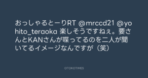 寺岡呼人 @yohito_teraoka – 1:53・2010年12月13日 2010 12/13 寺岡呼人 2010-12-13 おっしゃるとーりRT @mrccd21 @yohito_teraoka 楽しそうですねぇ。要さんとKANさんが喋ってるのを二人が聞いてるイメージなんですが(笑) Source:https://x.com/yohito_teraoka/status/13999835770... text X Post 寺岡呼人 寺岡呼人 この記事が気に入ったら フォローしてね! Follow @OtokoTimes1988 よかったらシェアしてね! URLをコピーしました! 寺岡呼人 @yohito_teraoka - 1:52・2010年12月13日 寺岡呼人 @yohito_teraoka - 1:57・2010年12月13日 関連記事 Artist 寺岡呼人 1968.02.07