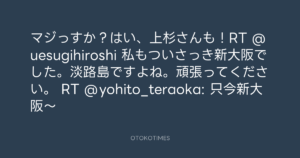 寺岡呼人 @yohito_teraoka – 12:31・2010年12月14日 2010 12/14 寺岡呼人 2010-12-14 マジっすか?はい、上杉さんも!RT @uesugihiroshi 私もついさっき新大阪でした。淡路島ですよね。頑張ってください。 RT @yohito_teraoka: 只今新大阪〜 Source:https://x.com/yohito_teraoka/status/14522908088... text X Post 寺岡呼人 寺岡呼人 この記事が気に入ったら フォローしてね! Follow @OtokoTimes1988 よかったらシェアしてね! URLをコピーしました! 寺岡呼人 @yohito_teraoka - 12:30・2010年12月14日 寺岡呼人 @yohito_teraoka - 12:34・2010年12月14日 関連記事 Artist 寺岡呼人 1968.02.07