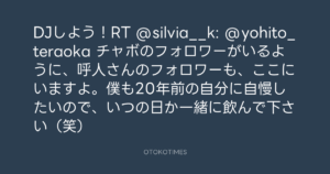 寺岡呼人 @yohito_teraoka – 9:36・2010年12月17日 2010 12/17 寺岡呼人 2010-12-17 DJしよう!RT @silvia__k: @yohito_teraoka チャボのフォロワーがいるように、呼人さんのフォロワーも、ここにいますよ。僕も20年前の自分に自慢したいので、いつの日か一緒に飲んで下さい(笑) Source:https://x.com/yohito_teraoka/status/15566075945... text X Post 寺岡呼人 寺岡呼人 この記事が気に入ったら フォローしてね! Follow @OtokoTimes1988 よかったらシェアしてね! URLをコピーしました! 寺岡呼人 @yohito_teraoka - 8:57・2010年12月17日 寺岡呼人 @yohito_teraoka - 21:56・2010年12月17日 関連記事 Artist 寺岡呼人 1968.02.07