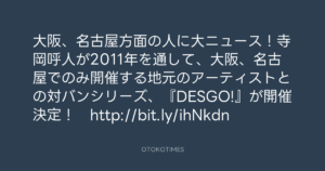 大阪、名古屋方面の人に大ニュース!寺岡呼人が2011年を通して、大阪、名古屋でのみ開催する地元のアーティストとの対バンシリーズ、『DESGO!』が開催決定! http://bit.ly/ihNkdn