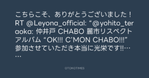 こちらこそ、ありがとうございました!RT @Leyona_official: “@yohito_teraoka: 仲井戸 CHABO 麗市リスペクトアルバム “OK!!! C’MON CHABO!!!” 参加させていただき本当に光栄です!! L