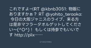 これですよー♪RT @kbnb3051: 物販にありますかぁ? RT @yohito_teraoka: 今日の大阪ジャニスのライブ、来る方は是非マフラータオルゲットしてください〜(^O^)! もしくは持参でもいいです http://plixi.com/p/65002143