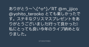 ありがとう〜\(^o^)/RT @m_jijico @yohito_teraoka とても楽しかったです。ステキなクリスマスプレゼントをありがとうございました☆行って良かった♪ 私にとっても良い今年のライブ納めとなりました。