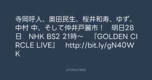 寺岡呼人 @yohito_teraoka – 16:01・2010年12月27日 2010 12/27 寺岡呼人 2010-12-27 寺岡呼人、奥田民生、桜井和寿、ゆず、中村 中、そして仲井戸麗市! 明日28日 NHK BS2 21時~ 『GOLDEN CIRCLE LIVE』 http://bit.ly/gN40WK Source:https://x.com/yohito_teraoka/status/19286800849... text X Post 寺岡呼人 寺岡呼人 この記事が気に入ったら フォローしてね! Follow @OtokoTimes1988 よかったらシェアしてね! URLをコピーしました! 寺岡呼人 @yohito_teraoka - 15:59・2010年12月27日 寺岡呼人 @yohito_teraoka - 17:53・2010年12月28日 関連記事 Artist 寺岡呼人 1968.02.07