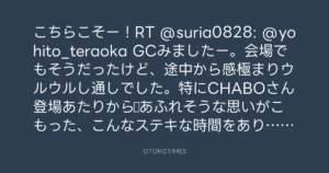 こちらこそー!RT @suria0828: @yohito_teraoka GCみましたー。会場でもそうだったけど、途中から感極まりウルウルし通しでした。特にCHABOさん登場あたりから♡あふれそうな思いがこもった、こんなステキな時間をありがとうございました☆
