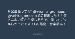 寺岡呼人 @yohito_teraoka – 23:28・2010年12月28日 2010 12/28 寺岡呼人 2010-12-28 音楽最高っすRT @ryoma_grampus: @yohito_teraoka GC観ました!!皆さん心の底から楽しそうで、僕もすごく楽しかったです!GC最高!音楽最高! Source:https://x.com/yohito_teraoka/status/19761519650... text X Post 寺岡呼人 寺岡呼人 この記事が気に入ったら フォローしてね! Follow @OtokoTimes1988 よかったらシェアしてね! URLをコピーしました! 寺岡呼人 @yohito_teraoka - 23:26・2010年12月28日 寺岡呼人 @yohito_teraoka - 23:29・2010年12月28日 関連記事 Artist 寺岡呼人 1968.02.07