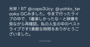 寺岡呼人 @yohito_teraoka – 23:31・2010年12月28日 2010 12/28 寺岡呼人 2010-12-28 光栄!RT @capo3Ucy: @yohito_teraoka GCみました。今まで行ったライブの中で、1番楽しかったな…と映像を見ながら再確認。私の人生の中のベストライブです!!素敵な時間をありがとうございました。 Source:https://x.com/yohito_teraoka/status/19762478393... text X Post 寺岡呼人 寺岡呼人 この記事が気に入ったら フォローしてね! Follow @OtokoTimes1988 よかったらシェアしてね! URLをコピーしました! 寺岡呼人 @yohito_teraoka - 23:29・2010年12月28日 寺岡呼人 @yohito_teraoka - 23:34・2010年12月28日 関連記事 Artist 寺岡呼人 1968.02.07