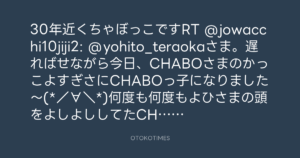 30年近くちゃぼっこですRT @jowacchi10jiji2: @yohito_teraokaさま。遅ればせながら今日、CHABOさまのかっこよすぎさにCHABOっ子になりました〜(*/∀\*)何度も何度もよひさまの頭をよしよししてたCHABOさま☆感動です◎