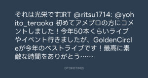 それは光栄です♪RT @ritsu1714: @yohito_teraoka 初めてアメブロの方にコメントしました!今年50本くらいライブやイベント行きましたが、GoldenCircleが今年のベストライブです!最高に素敵な時間をありがとうございました #GC15