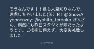 寺岡呼人 @yohito_teraoka – 1:15・2010年12月29日 2010 12/29 寺岡呼人 2010-12-29 そうなんです!!僕も人見知りなんで、遠慮しちゃいました(笑)RT @ShowAyanocozey: @yohito_teraoka 呼人さん、偶然にも昨日スタジオが隣だったようです。ご挨拶に伺えず、大変失礼致しました! Source:https://x.com/yohito_teraoka/status/19788517349... text X Post 寺岡呼人 寺岡呼人 この記事が気に入ったら フォローしてね! Follow @OtokoTimes1988 よかったらシェアしてね! URLをコピーしました! 寺岡呼人 @yohito_teraoka - 0:59・2010年12月29日 寺岡呼人 @yohito_teraoka - 1:15・2010年12月29日 関連記事 Artist 寺岡呼人 1968.02.07