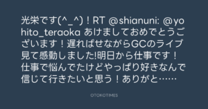 光栄です(^_^)!RT @shianuni: @yohito_teraoka あけましておめでとうございます!遅ればせながらGCのライブ見て感動しました!明日から仕事です!仕事で悩んでたけどやっぱり好きなんで信じて行きたいと思う!ありがとう!