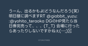 うーん、出るかもよ♪どうなんだろう(笑)明日昼に調べますRT @giabbit_yuzu: :@yohito_teraoka DGのHP見たら当日券完売って、、、(T_T) 会場に行ったらあったりしないですかねぇ(ーー;)⁇