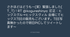 寺岡呼人 @yohito_teraoka – 0:05・2011年1月8日 2011 1/08 寺岡呼人 2011-01-08 さきほどはどうもー(笑)緊張しました(T_T)!RT @kogureshinya: 訂正:ヒックスヴル→ヒックスヴィル 会場にてヒックスTEEの販売もございます。TEE写真無かったので明日PICしてツイートします〜 Source:https://x.com/yohito_teraoka/status/23394765479... text X Post 寺岡呼人 寺岡呼人 この記事が気に入ったら フォローしてね! Follow @OtokoTimes1988 よかったらシェアしてね! URLをコピーしました! 寺岡呼人 @yohito_teraoka - 0:03・2011年1月8日 寺岡呼人 @yohito_teraoka - 0:35・2011年1月8日 関連記事 Artist 寺岡呼人 1968.02.07