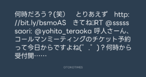 何時だろう?(笑) とりあえず http://bit.ly/bsmoAS きてね♪RT @ssssssaori: @yohito_teraoka 呼人さーん、コールマンミーティングのチケット予約って今日からですよね(゜.゜)?何時から受付開始とかありますか;;?