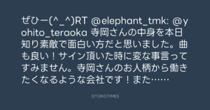 ぜひー(^_^)RT @elephant_tmk: @yohito_teraoka 寺岡さんの中身を本日知り素敵で面白い方だと思いました。曲も良い!サイン頂いた時に変な事言ってすみません。寺岡さんのお人柄から働きたくなるような会社です!またライヴ行きます。
