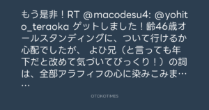 もう是非!RT @macodesu4: @yohito_teraoka ゲットしました!齢46歳オールスタンディングに、ついて行けるか心配でしたが、 よひ兄(と言っても年下だと改めて気づいてびっくり!)の詞は、全部アラフィフの心に染みこみました!めっちゃよかった!素敵でした!