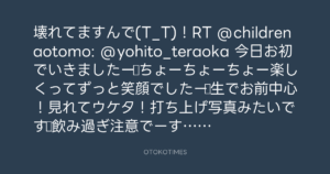 壊れてますんで(T_T)!RT @childrenaotomo: @yohito_teraoka 今日お初でいきましたー♪ちょーちょーちょー楽しくってずっと笑顔でしたー♪生でお前中心!見れてウケタ!打ち上げ写真みたいです♪飲み過ぎ注意でーす( ´ ▽ ` )ノ