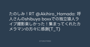 寺岡呼人 @yohito_teraoka – 4:42・2011年1月9日 2011 1/09 寺岡呼人 2011-01-09 たのしみ!RT @Akihiro_Hamada: 呼人さんのshibuya boxxでの独立猿人ライブ撮影楽しかった!集まってくれたカメラマンの方々に感謝(T_T) Source:https://x.com/yohito_teraoka/status/23826922953... text X Post 寺岡呼人 寺岡呼人 この記事が気に入ったら フォローしてね! Follow @OtokoTimes1988 よかったらシェアしてね! URLをコピーしました! 寺岡呼人 @yohito_teraoka - 4:33・2011年1月9日 寺岡呼人 @yohito_teraoka - 21:59・2011年1月9日 関連記事 Artist 寺岡呼人 1968.02.07