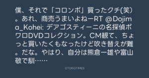僕、それで「コロンボ」買ったクチ(笑)。あれ、商売うまいよねーRT @Dojima_Kohei: デアゴスティーニの名探偵ポワロDVDコレクション。CM観て、ちょっと買いたくもなったけど吹き替えが難。だな。やはり、自分は熊倉一雄や富山敬で馴染んでしまっているのであるからして!