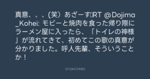 寺岡呼人 @yohito_teraoka – 7:25・2011年2月7日 2011 2/07 寺岡呼人 2011-02-07 真意、、、(笑)あざーす♪RT @Dojima_Kohei: モビーと焼肉を食った帰り際にラーメン屋に入ったら、「トイレの神様」が流れてきて、初めてこの歌の真意が分かりました。呼人先輩、そういうことか! Source:https://x.com/yohito_teraoka/status/34377057756... text X Post 寺岡呼人 寺岡呼人 この記事が気に入ったら フォローしてね! Follow @OtokoTimes1988 よかったらシェアしてね! URLをコピーしました! 寺岡呼人 @yohito_teraoka - 4:28・2011年2月7日 寺岡呼人 @yohito_teraoka - 12:04・2011年2月7日 関連記事 Artist 寺岡呼人 1968.02.07