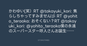かわゆい(笑)RT @takayuki_kori: 焦らしちゃってすみません☆彡 RT @yohito_teraoka: おそくない?RT @takayuki_kori: @yohito_teraoka僕の永遠のスーパースター呼人さんお誕生日おめでとおございます