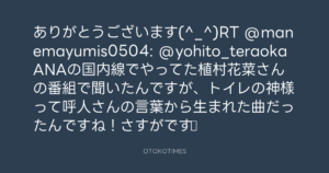 ありがとうございます(^_^)RT @manemayumis0504: @yohito_teraoka ANAの国内線でやってた植村花菜さんの番組で聞いたんですが、トイレの神様って呼人さんの言葉から生まれた曲だったんですね!さすがです☆