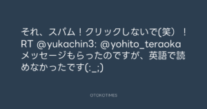 寺岡呼人 @yohito_teraoka – 12:17・2011年2月8日 2011 2/08 寺岡呼人 2011-02-08 それ、スパム!クリックしないで(笑)!RT @yukachin3: @yohito_teraoka メッセージもらったのですが、英語で読めなかったです(:_;) Source:https://x.com/yohito_teraoka/status/34812965966... text X Post 寺岡呼人 寺岡呼人 この記事が気に入ったら フォローしてね! Follow @OtokoTimes1988 よかったらシェアしてね! URLをコピーしました! 寺岡呼人 @yohito_teraoka - 5:59・2011年2月8日 青山英樹 @aoyama_hideki - 15:35・2011年2月8日 関連記事 Artist 寺岡呼人 1968.02.07