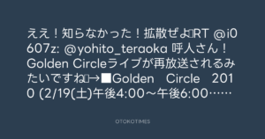 ええ!知らなかった!拡散ぜよ♪RT @i0607z: @yohito_teraoka 呼人さん!Golden Circleライブが再放送されるみたいですね♪→■Golden Circle 2010 (2/19(土)午後4:00〜午後6:00 BS2)