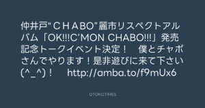 寺岡呼人 @yohito_teraoka – 10:19・2011年2月16日 2011 2/16 寺岡呼人 2011-02-16 仲井戸“CHABO”麗市リスペクトアルバム「OK!!!C’MON CHABO!!!」発売記念トークイベント決定! 僕とチャボさんでやります!是非遊びに来て下さい(^_^)! http://amba.to/f9mUx6 Source:https://x.com/yohito_teraoka/status/37682360430... text X Post 寺岡呼人 寺岡呼人 この記事が気に入ったら フォローしてね! Follow @OtokoTimes1988 よかったらシェアしてね! URLをコピーしました! 青山英樹 @aoyama_hideki - 23:29・2011年2月15日 寺岡呼人 @yohito_teraoka - 10:24・2011年2月16日 関連記事 Artist 寺岡呼人 1968.02.07