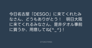 今日名古屋「DESGO」に来てくれたみなさん、どうもありがとう! 明日大阪に来てくれるみなさん、是非タオル事前に買うか、用意してね(^_^)!