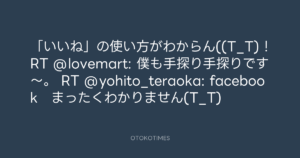 寺岡呼人 @yohito_teraoka – 18:56・2011年2月24日 2011 2/24 寺岡呼人 2011-02-24 「いいね」の使い方がわからん((T_T)!RT @lovemart: 僕も手探り手探りです~。 RT @yohito_teraoka: facebook まったくわかりません(T_T) Source:https://x.com/yohito_teraoka/status/40711754602... text X Post 寺岡呼人 寺岡呼人 この記事が気に入ったら フォローしてね! Follow @OtokoTimes1988 よかったらシェアしてね! URLをコピーしました! 寺岡呼人 @yohito_teraoka - 17:56・2011年2月24日 青山英樹 @aoyama_hideki - 18:57・2011年2月24日 関連記事 Artist 寺岡呼人 1968.02.07