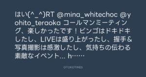 はい(^_^)RT @mina_whitechoc @yohito_teraoka コールマンミーティング、楽しかったです!ビンゴはドキドキしたし、LIVEは盛り上がったし、握手&写真撮影は感激したし、気持ちの伝わる素敵なイベント… http://tl.gd/9138vv