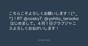 こちらこそよろしくお願いします!(^_^)!RT @cosky7: @yohito_teraoka はじめまして。4月1日クラブジャニスよろしくおねがいします!