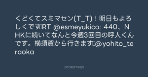 寺岡呼人 @yohito_teraoka – 23:00・2011年3月4日 2011 3/04 寺岡呼人 2011-03-04 くどくてスミマセン(T_T)!明日もよろしくです♪RT @esmeyukico: 440、NHKに続いてなんと今週3回目の呼人くんです。横須賀から行きます♪@yohito_teraoka Source:https://x.com/yohito_teraoka/status/43672202276... text X Post 寺岡呼人 寺岡呼人 この記事が気に入ったら フォローしてね! Follow @OtokoTimes1988 よかったらシェアしてね! URLをコピーしました! 寺岡呼人 @yohito_teraoka - 22:27・2011年3月4日 寺岡呼人 @yohito_teraoka - 23:06・2011年3月4日 関連記事 Artist 寺岡呼人 1968.02.07
