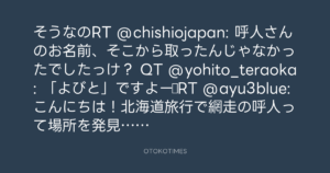 そうなのRT @chishiojapan: 呼人さんのお名前、そこから取ったんじゃなかったでしたっけ? QT @yohito_teraoka: 「よびと」ですよー♪RT @ayu3blue: こんにちは!北海道旅行で網走の呼人って場所を発見。「よぶと」らしいです。