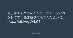 寺岡呼人 @yohito_teraoka – 9:58・2011年3月11日 2011 3/11 寺岡呼人 2011-03-11 明日はチャボさんとタワーでトークイベントです!是非遊びに来てくださいね。 http://bit.ly/gWlbjM Source:https://x.com/yohito_teraoka/status/46012207410... text X Post 寺岡呼人 寺岡呼人 この記事が気に入ったら フォローしてね! Follow @OtokoTimes1988 よかったらシェアしてね! URLをコピーしました! 寺岡呼人 @yohito_teraoka - 9:12・2011年3月11日 寺岡呼人 @yohito_teraoka - 10:03・2011年3月11日 関連記事 Artist 寺岡呼人 1968.02.07