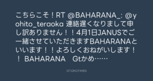 こちらこそ!RT @BAHARANA_: @yohito_teraoka 連絡遅くなりまして申し訳ありません!!4月1日JANUSでご一緒させていただきますBAHARANAといいます!!よろしくおねがいします!! BAHARANA Gtかめだ