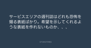 寺岡呼人 @yohito_teraoka – 11:03・2011年4月2日 2011 4/02 寺岡呼人 2011-04-02 サービスエリアの週刊誌はどれも恐怖を煽る表紙ばかり。希望を示してくれるような表紙を作れないものか、、、 Source:https://x.com/yohito_teraoka/status/54000905535... text X Post 寺岡呼人 寺岡呼人 この記事が気に入ったら フォローしてね! Follow @OtokoTimes1988 よかったらシェアしてね! URLをコピーしました! 寺岡呼人 @yohito_teraoka - 10:12・2011年4月2日 寺岡呼人 @yohito_teraoka - 11:25・2011年4月2日 関連記事 Artist 寺岡呼人 1968.02.07