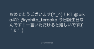 寺岡呼人 @yohito_teraoka – 12:42・2011年4月2日 2011 4/02 寺岡呼人 2011-04-02 おめでとうございます(^_^)!RT @aika42: @yohito_teraoka 今日誕生日なんです!一言いただけると嬉しいです♪(´ε` ) Source:https://x.com/yohito_teraoka/status/54025947686... text X Post 寺岡呼人 寺岡呼人 この記事が気に入ったら フォローしてね! Follow @OtokoTimes1988 よかったらシェアしてね! URLをコピーしました! 寺岡呼人 @yohito_teraoka - 12:21・2011年4月2日 寺岡呼人 @yohito_teraoka - 12:45・2011年4月2日 関連記事 Artist 寺岡呼人 1968.02.07